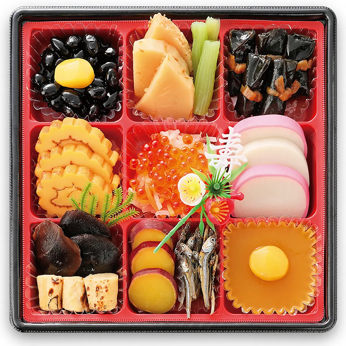 黒豆、栗、田作り、伊達巻、味付け数の子、いくら、なます、紅白かまぼこ、昆布巻、鶏の照焼、栗きんとん、煮物(タケノコ、ゴボウ、人参、こんにゃく、椎茸)